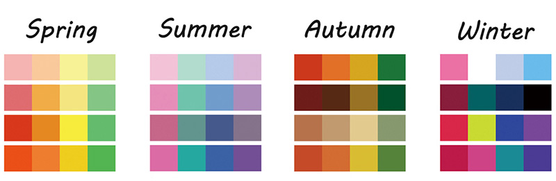 パーソナルカラーは、大きく分けて「イエローベース」と「ブルーベース」の2タイプに分類され、さらに色の明度・彩度などの特徴で、「Spring(スプリング)」「Summer(サマー)」「Autumn(オータム)」「Winter(ウィンター)」の4タイプに分かれます。